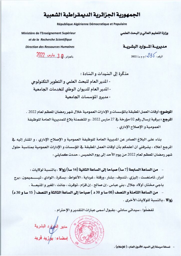 أوقات العمل المطبقة في المؤسسات و الإدارات العمومية بمناسبة حلول شهر رمضان المعظم لعام 2022 31 مارس، 2022 أخبار الجامعة 2,456 زيارة شاركها tweet