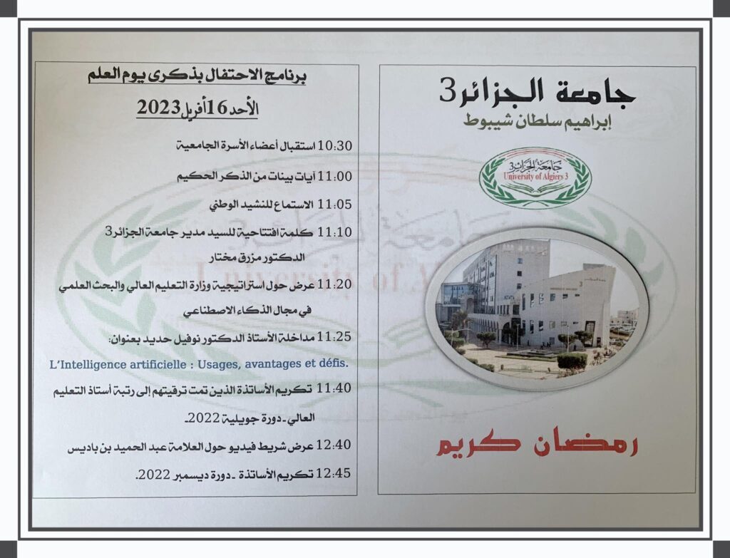 Program of celebration of Science Day on Sunday, April 16th, 2023. cellulenumalger3 15/04/2023 actualités, Bourses d'études Leave a comment 381 Views Related Articles The university president inspects several projects at the Institute of Physical Education and Sports 26/12/2023 The university director receives representatives of the Entrepreneurial Thought Development Club 24/12/2023 The scientific clubs of the University of Algiers 3 warmly applaud the global reform strategy of His Excellency, the Minister of Higher Education and Scientific Research, Professor Kamel Baddari. 24/12/2023 Share Facebook Twitter Google + Stumbleupon LinkedIn Pinterest