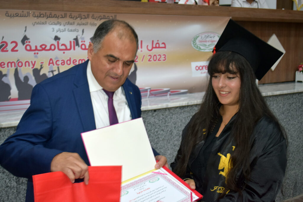 This recognition was a tribute to the efforts made by all stakeholders, including professors, students, administrative staff, technical personnel, professors and employees unions, student organizations, and scientific clubs, to ensure the success of the academic year. During his speech, Professor Abdelhamid Hassiani, in charge of managing the affairs of the University of Algiers 3, congratulated the students and their families for this achievement, wishing them further success and excellence in their academic and professional lives. He also expressed gratitude and appreciation to all members of the university community, social and economic partners, and the official sponsor of the event, Ooredoo, for their contributions to advancing knowledge and carrying out their duties with dedication.