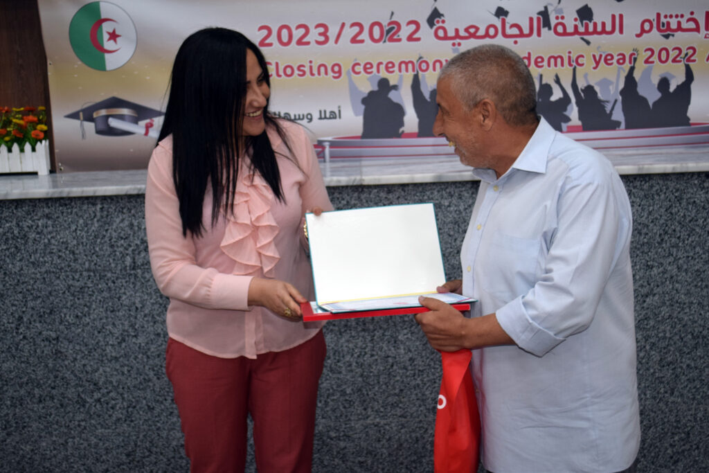 On Thursday, July 20, 2023, Professor Dr. Abdelhamid Hassiani, in charge of managing the affairs of the University of Algiers 3, presided over the closing ceremony of the academic year 2022/2023. The ceremony took place at 10:30 AM in the newly built auditorium of the Faculty of Economic Sciences, Business, and Management sciences. The event was organized by the University Directorate to honor the valedictorians, students with disabilities, international graduates, and employees who retired.