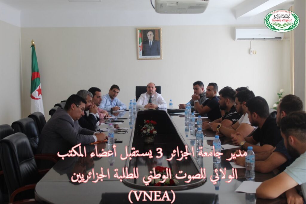 On Thursday, October 26, 2023, the Director of the University of Algiers 3, Professor Khaled Rouaski, received members of the Wilaya office of the National Voice of Algerian Students (VNEA) organization, in order to listen to students’ concerns and find solutions, as part of a series of consultation meetings with the various student organizations approved by the Ministry of Higher Education and Scientific Research.