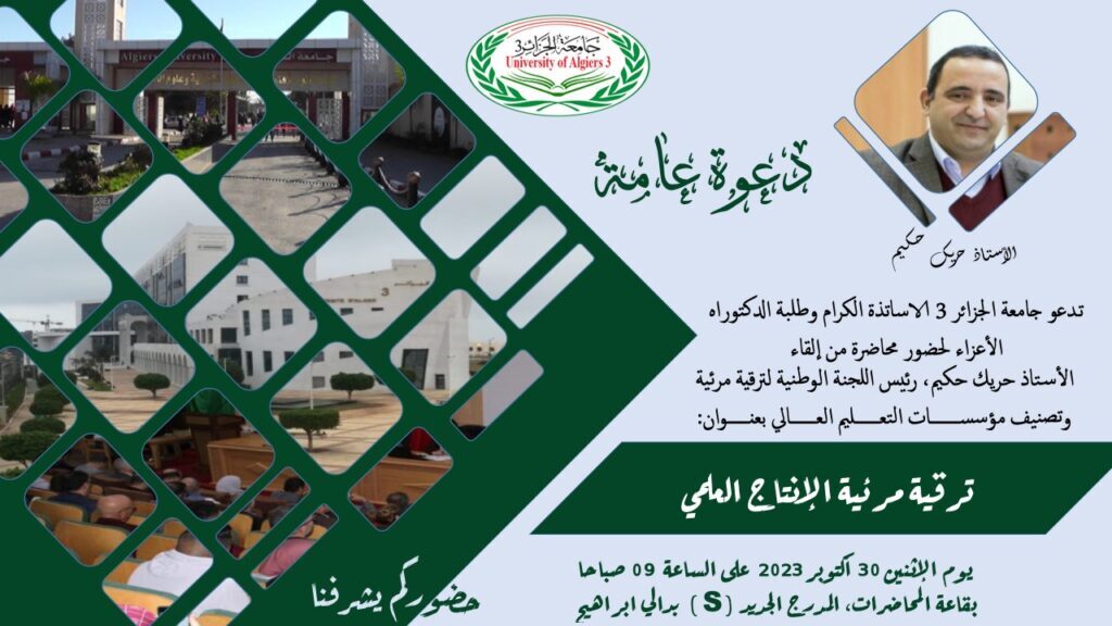 The University of Algiers 3 kindly invites the professors and PhD students to attend a lecture given by Professor Harik Hakim, President of the National Committee for the Promotion of Visibility and Ranking of Higher Education Institutions, entitled: “Promoting the visibility of scientific production”.