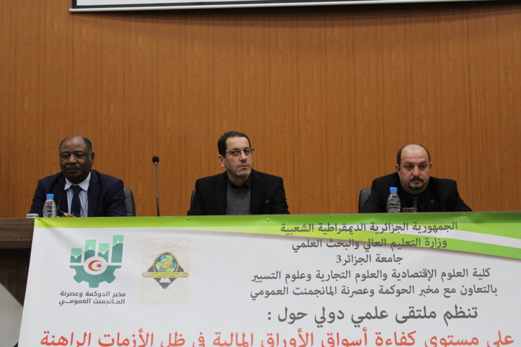 In his opening speech of the conference, the director of the university thanked the organizers of this conference which comes in a context of major economic transformations , in particular regarding the major impact of information technology on the efficiency level of financial markets. The director of the university stressed the importance of the role of scientific research in improving the visibility of the university and the commitment of the University of Algiers 3 to value the outputs of scientific research and to encourage teachers through university laboratories and research teams to organize scientific events in line with the national program for scientific research and technological development.